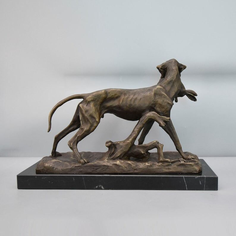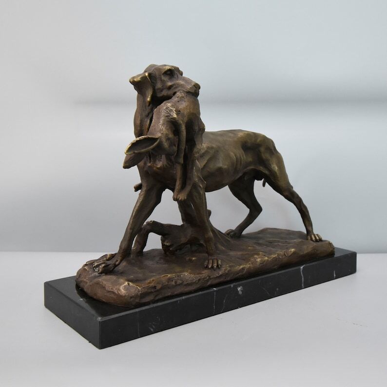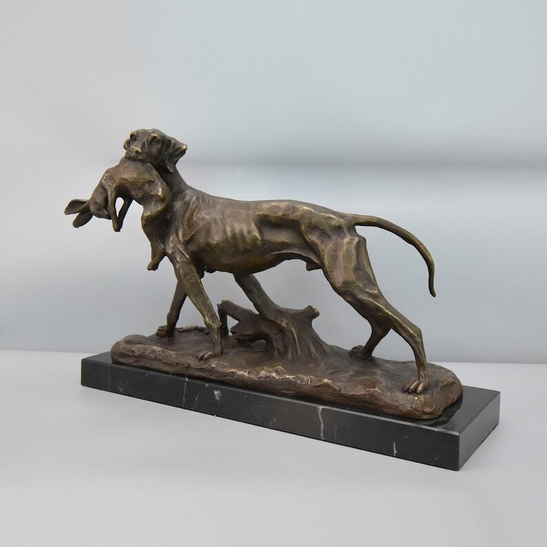 Pointer Hunting Dog with Hare, Large Bronze Sculpture on Marble Base, Vintage Figurine, Gift Idea for Hunter