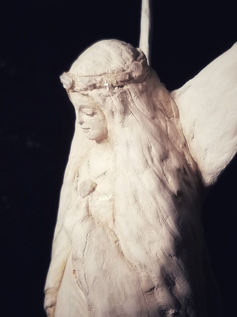 This beautiful one is "Leila Faerie". She is a Faerie of Danu and is very wise, protective, serene, and is focused on her mission. She is a guardian of the realms and by her side is her guardian winged lion (separate sculpture) keeping her safe and protected while she works keeping the different realms full of light and safe passage. On her head is a golden crown adorned with healing protective crystals of selenite and on her bodice is a moonstone. She is cast in porcelain clay by hand and is exquisitely "tinted" using natural berries, teas and earth (pigments) by the artist.