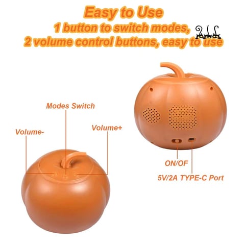 Talking and Singing Pumpkin Toy comes with a built-in Speaker and Simple 3 button controls: 2 volume control buttons, and 1 Skip button to skip animations, You can even pause animations with the Still mode. It is a small, short-throw projector and built-in speakers that provide entertainment – sound and animation.
