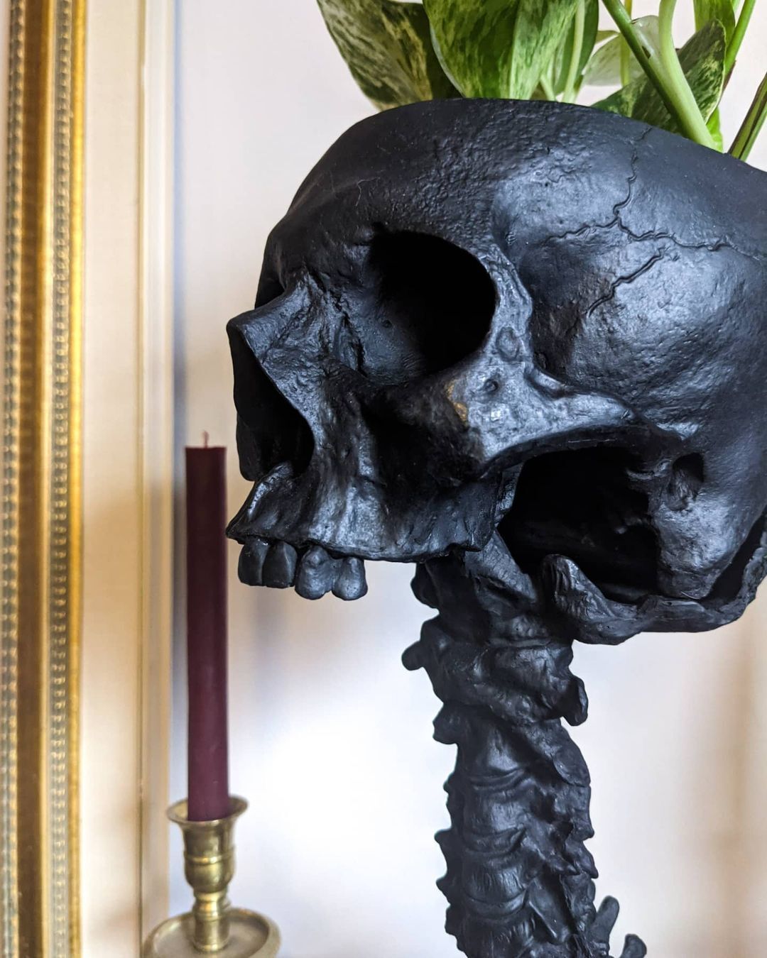 Made in high quality heat resistant resin, they will never warp while plants are sunbathing. An interlocking system allows the skull planter to sit comfortably and securely on the spine stand.Psst! Cats are no match for the sturdy cement base.