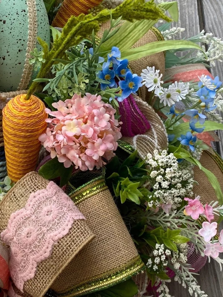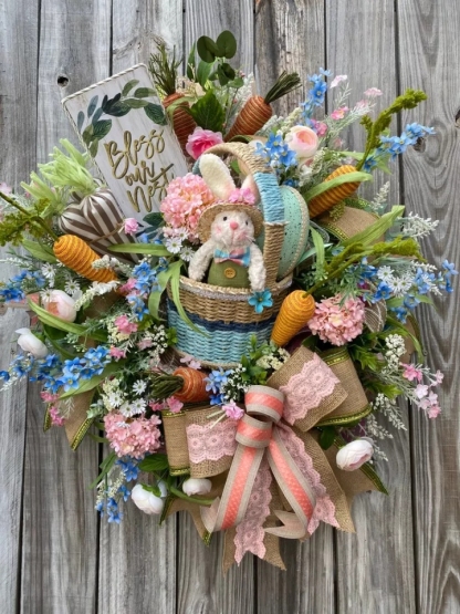 🐰 Easter basket filled with moss, floral, and a large Easter egg, and of course a cute mini bunny 🐰 Loaded with blue's, pink and white floral. High quality pink hydrangea's, carrots, and more. 🐰 Designer burlap lined with green ribbon. pink lace burlap ribbon and more. 🐰 Last but not least a, "bless this nest" sign with a touch of trim. 🐰 Approximately, 15 inches by 14 inches.