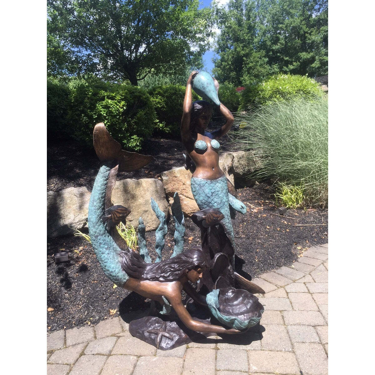Make a lasting impression on guests and visitors with our beautifully designed bronze lost-wax mermaid fountain statue. Showcased in our bronze mermaid collection, this duo is featured together in an underwater setting as they collect seashells while a sea turtle and two striped fish swim around them. One mermaid swims as she holds a large open shell and a starfish lays below her, while the other mermaid is featured upward as though standing as she holds a conch above her head. Both mermaids are stunningly designed from their long, wavy hair cascading down their backs as though realistically moving in water to the incredibly detailed scales on their tails.