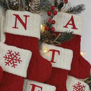 Patterns with capital letters, knitted patterns, red and white stitching, with a convenient sling to help hang it. It is a great decoration for Christmas and New Year.