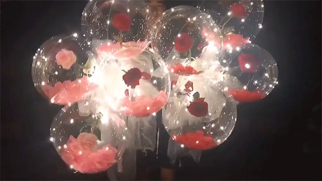 Huge artificial rose, the diameter can reach 40-45cm after inflating, the color is bright。The rose is installed in a transparent bubble ball. The most innovative thing we did was to add LED light strings to create the most beautiful bouquet we've ever seen.