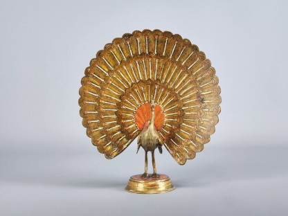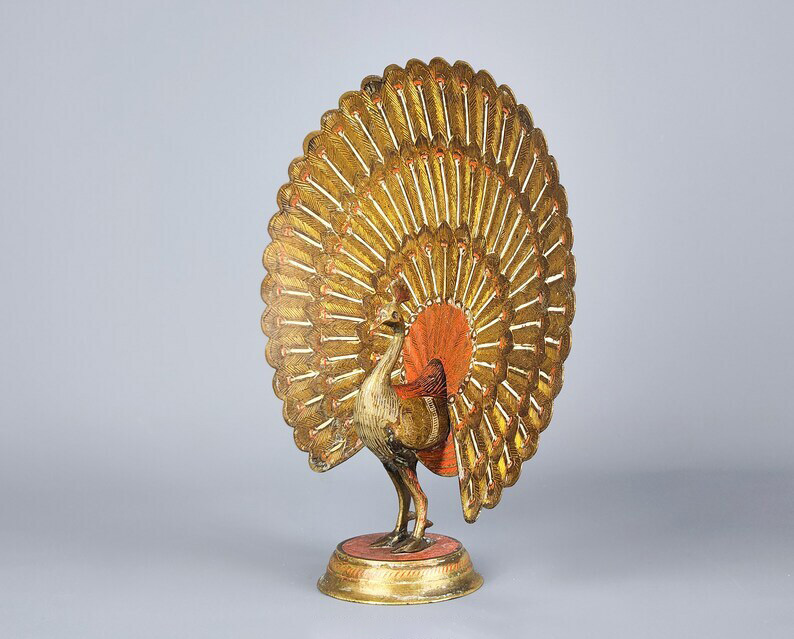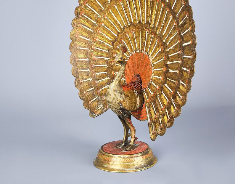 Pair of Brass Enameled Peacock Statues | Vintage Etched Metal Couple Peacocks Bird Sculptures | Peacock Unfolded Tail Figurines Figures Gift