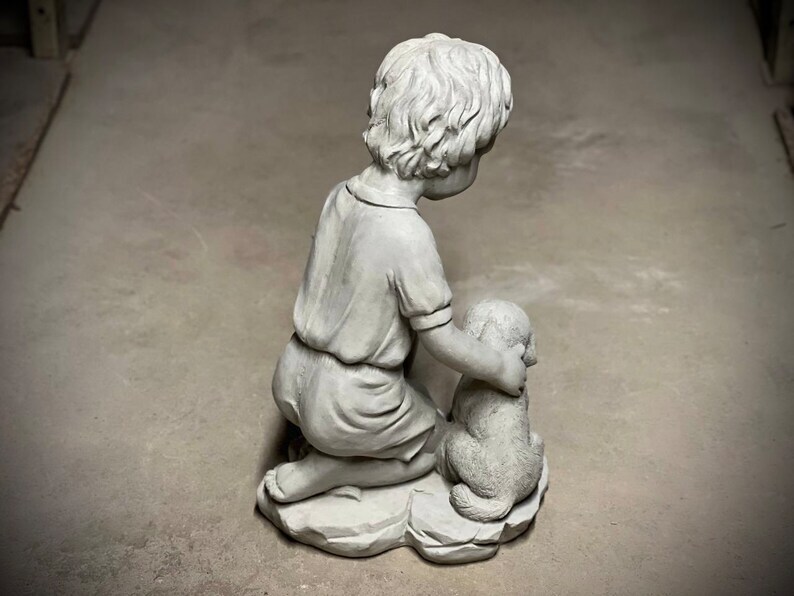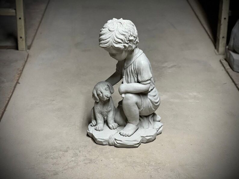 Realistic boy with dog statue Concrete boy with dog figurine Outdoor garden or backyard decoration