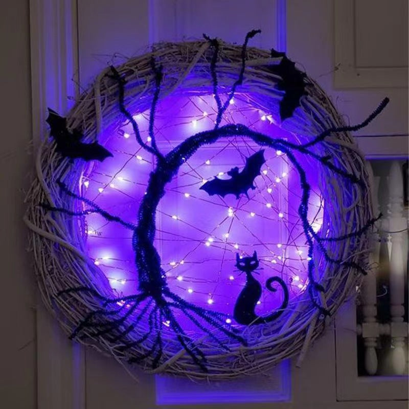 Halloween Decorations Witch Hat and Legs Wreath, Lighted with 30 LED Orange Lights, Front Door Wall Light up Wreath