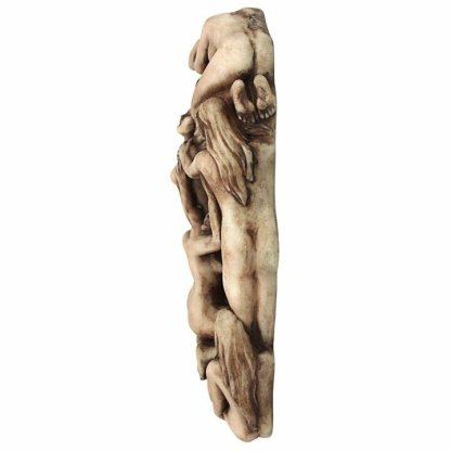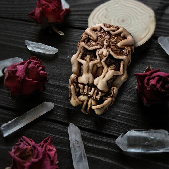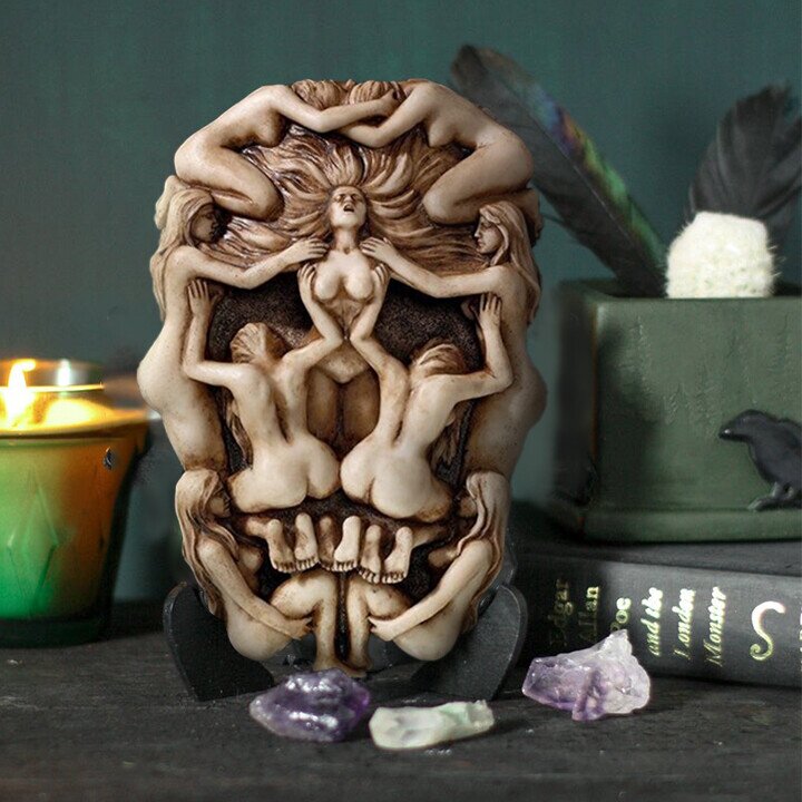 From a Latin phrase reminding all to remember, you too will die, this victorian style metaphoric optical illusion echoes life beckoning return to the grave. Cast in quality designer resin, the lithe human figures in this beautiful vanity form a starry-eyed skull as a visual pun on the fleeting flame of life. This artist's sobering and achingly beautiful, goth style work of art is hand-painted in an antique bone finish.