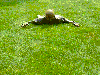 ANIMATED CRAWLING ZOMBIE WITH LIGHTS & SOUND: Zombie’s eyes will light up, wiggle his head and he’ll drag himself forward while making scary sounds; powered by 3AA batteries (not included).