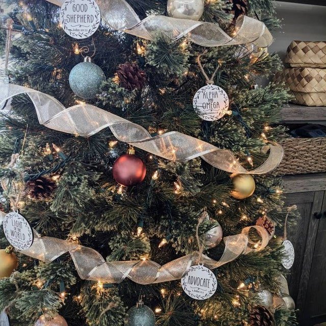 This names of Christ Christmas ornament advent set is the perfect way to focus on Christ during the Christmas season. It also works great to focus on Christ during Easter week if you have an Easter tree. Choose from a set of 12 or 24 ornaments, each with a different name of Christ and a corresponding scripture reference (from the KJV Bible) to look up.