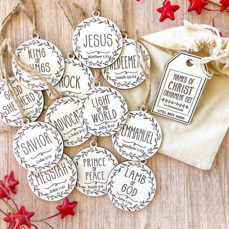 The listing picture shows the names included in the set of 12. The set of 24 names of Christ ornaments include: