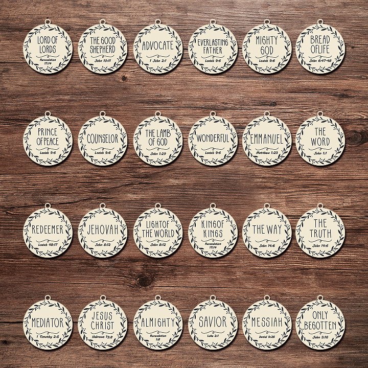 Available as a set of 12 names of Christ ornaments, or as set of 24 names of Christ ornaments that would be a meaningful advent calendar for those who want to make this a month-long tradition.
