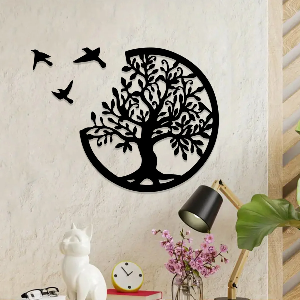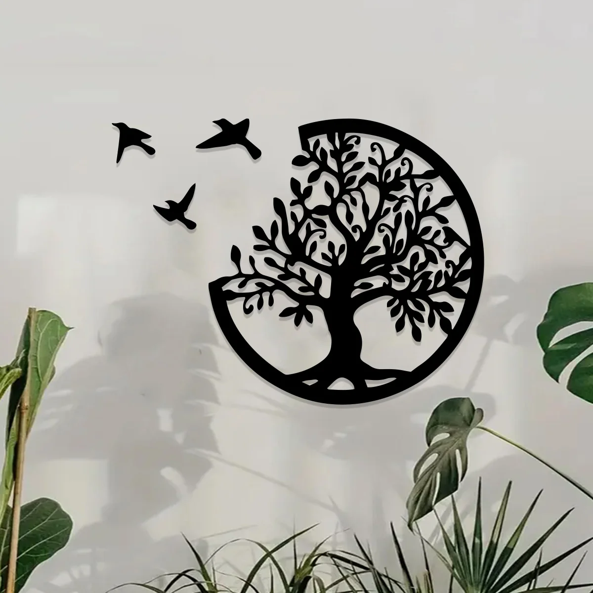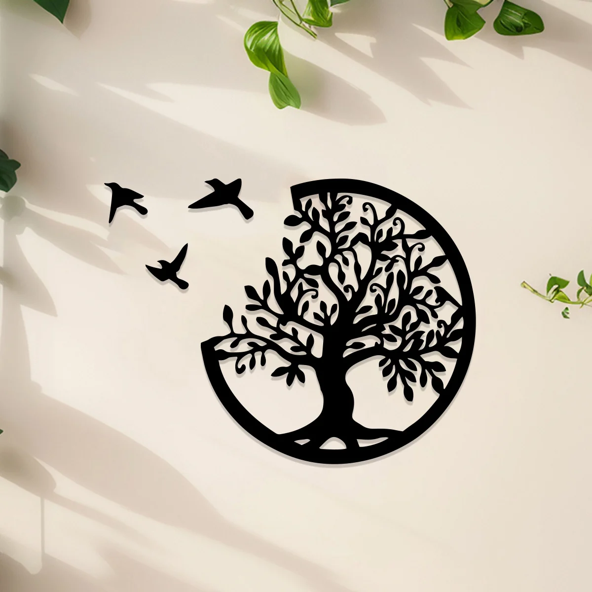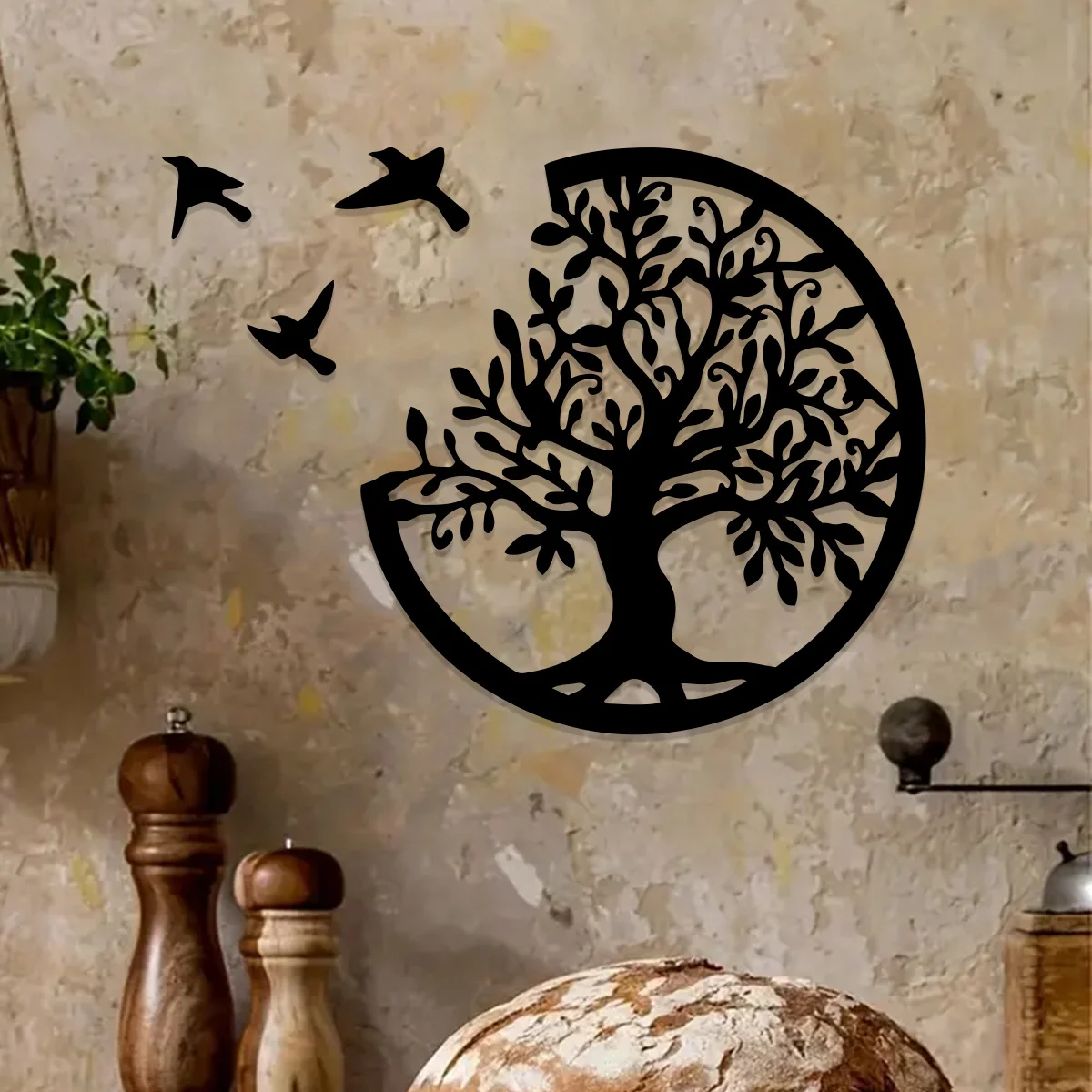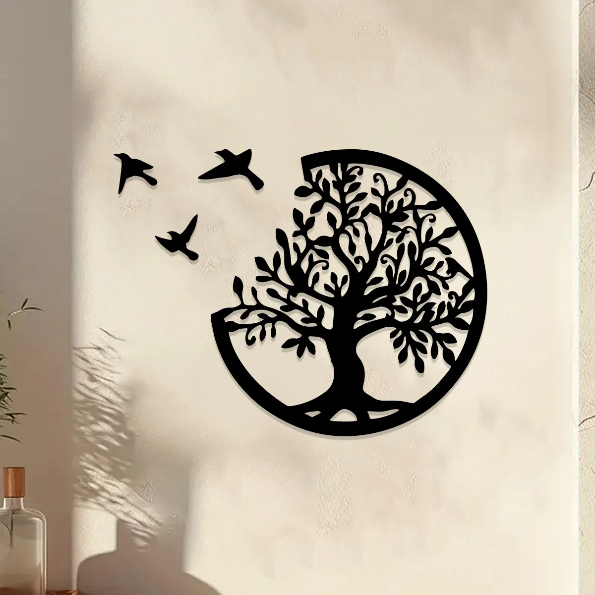 Black Wooden Tree of Life Wall Hanging - Round Bird Silhouette Art Decor for Boho, Witchy, and Modern Indoor Spaces