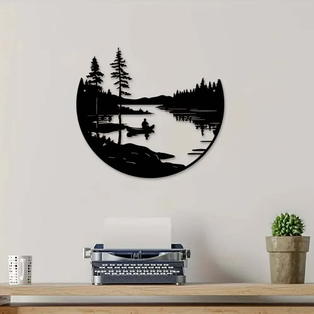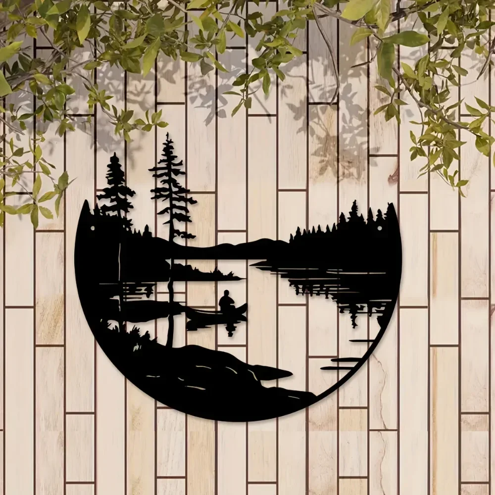 Bohemian-Inspired Metal Wall Art: Scenic Lake & Mountain Silhouette Round Sculpture for Elegant Home and Patio Decor