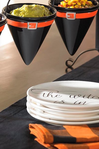 Use hooks to hang a chalkboard-style signs for sketching out a funny greeting or directing guests to snacks; or use them to hang three ceramic, hat-shaped serving bowls, and fill with candies, condiments, or a selection of salsa if you're putting out a "hex mex" spread. Sign and three bowls are included.