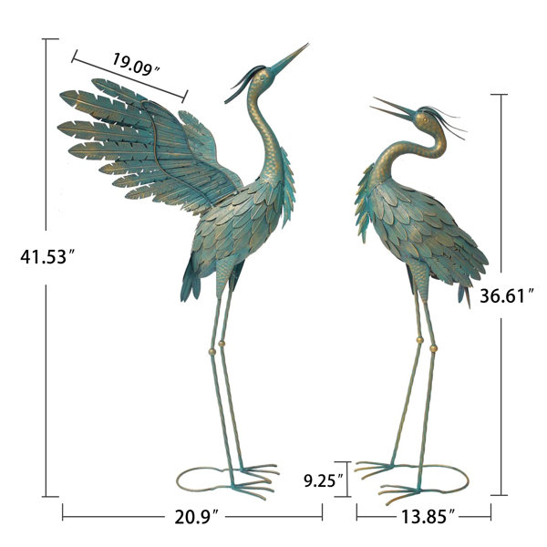 Add a whimsical and playful look to your outdoor area with this classic crane statue set. Whether you want to add a splash of color to the lawn or a graceful vivid touch to your backyard, this is a must-have bird statue decoration. Hand-crafted from high-quality metal materials and finished in a shimmering copper-patina paint coat, it features incredibly realistic details with all individual feathers and lots of embossed textures to capture the beauty of cranes. Designed with two different postures, one crane is spreading wings as if to fly into the sky, while the other opens its beak to cheer up for its friend. Their amazing lifelike appearance is sure to create a compelling appeal to your outdoor or indoor area and delight your guests.