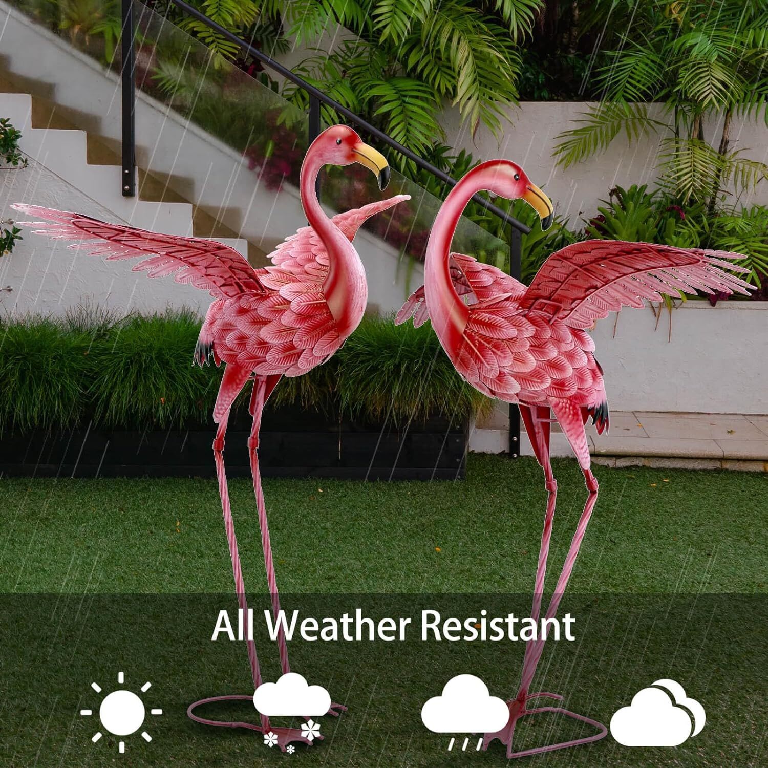 Assemble Easily: Flamingo yard decor can put together easily, just slide bodies into legs and insert the wings into the bodies. Bird statue is painted with high-quality varnish and don’t worry about the statue will rust and fade.