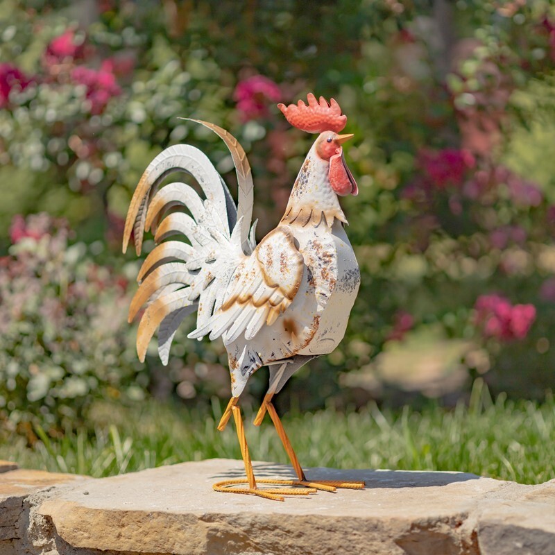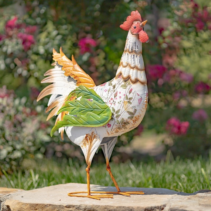 D 27.5" Tall White Rooster with Floral Print Body and Green Wings