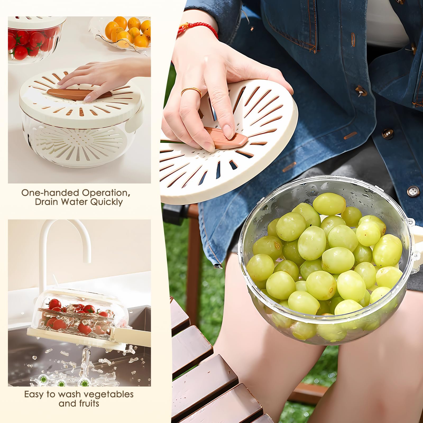 Draining Quikly: The lid of the vegetable washing basket is ingeniously designed with a hollow net, featuring a knob for opening and closing, thereby facilitating the washing and draining of fruits and vegetables.