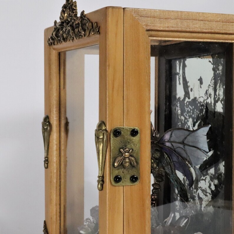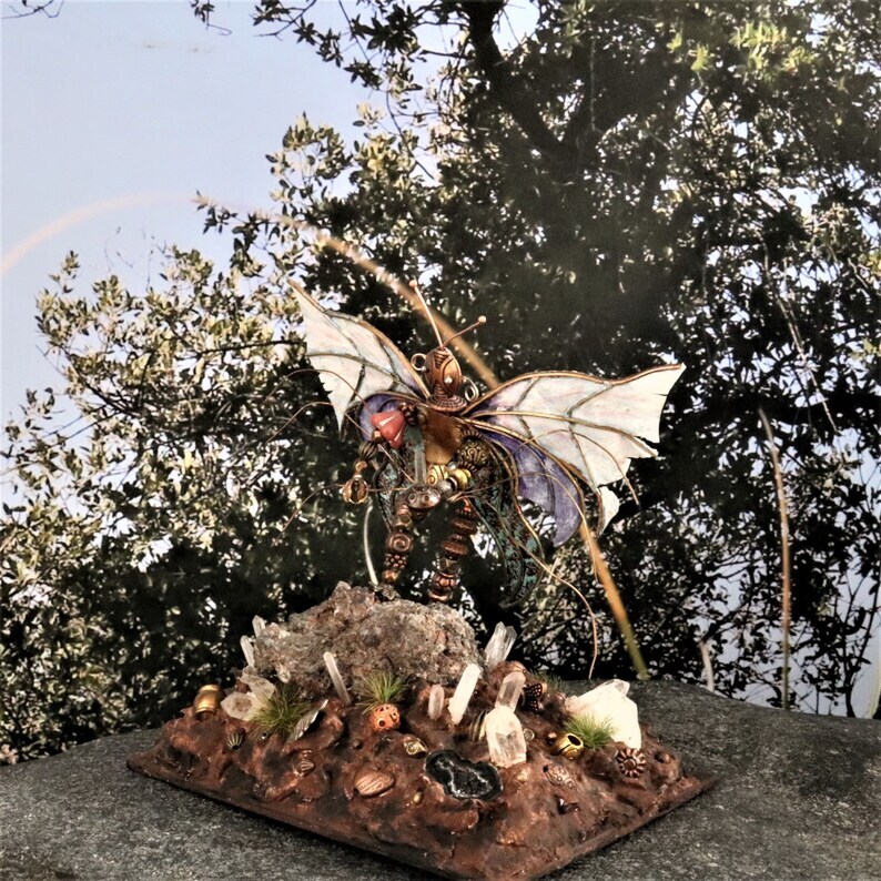 A one of a kind magical fairy shadowbox. A fantasy nature shrine to soothe you and spark your imagination. A miniature fairy garden sculpture. A tiny steampunk fairy in a treasure garden diorama. Natural Tibetan quartz crystals, a Tabasco geode, natural stone, magical charms and beads and delightful tiny tufts of real looking grass make a magical home for this tiny fairy who's a handmade assemblage of mixed metal and glass beads, hand soldered brass wire and hand painted paper wings. Housed in a beautiful pine wood and glass box embellished with vintage solid brass stampings.