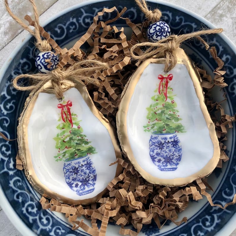 Exquisite Craftsmanship:Oysters are embellished with decoupage print on the inside and finished with gold enamel on the reverse side to create one of a kind ornaments! A Blue and White porcelain bead and a jute hanger complete the look. This listing features a print of a delicate Christmas tree planted within a blue and white porcelain container.