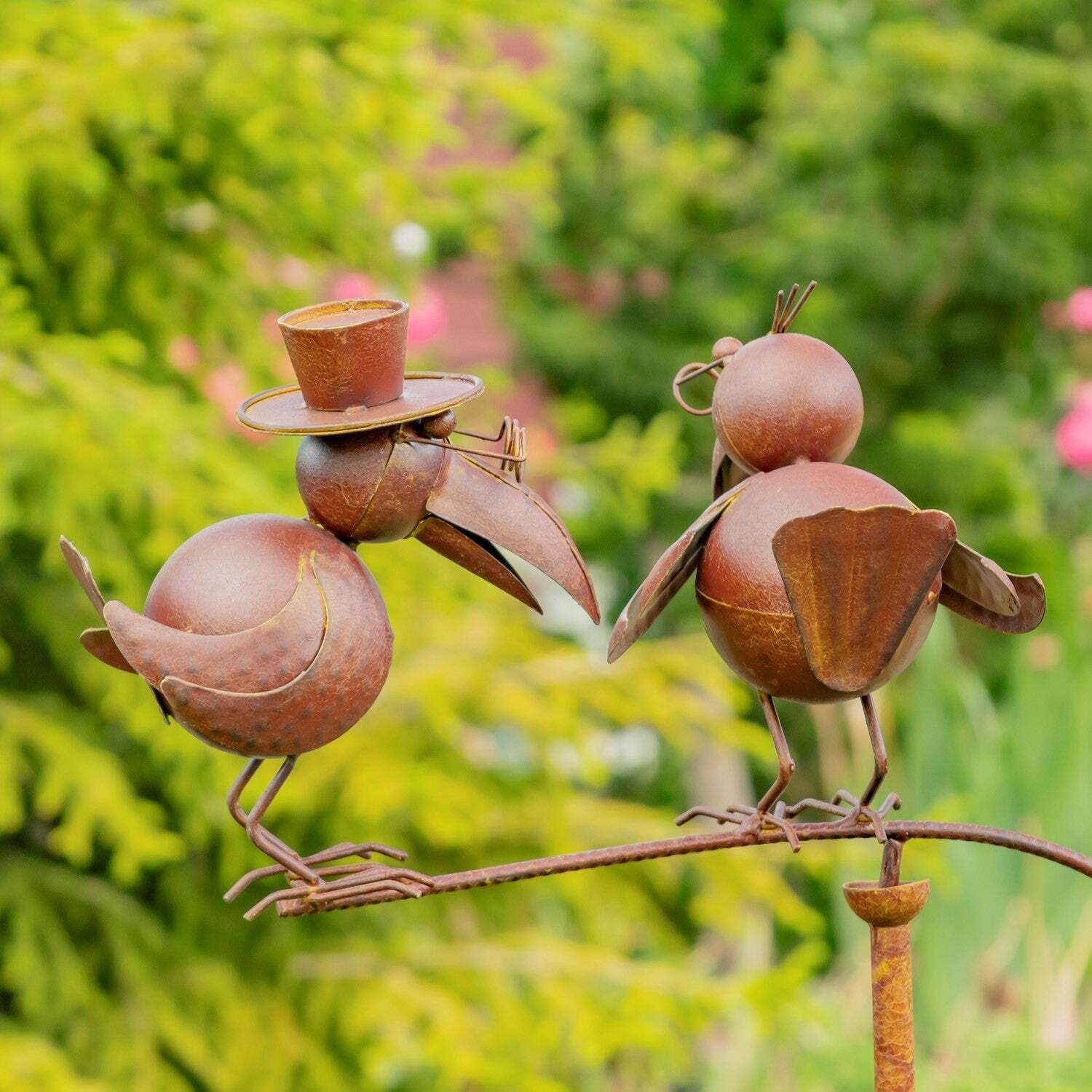 Each stake is made of sturdy, powder coated iron and features two raven friends with glasses and one even has a hat.