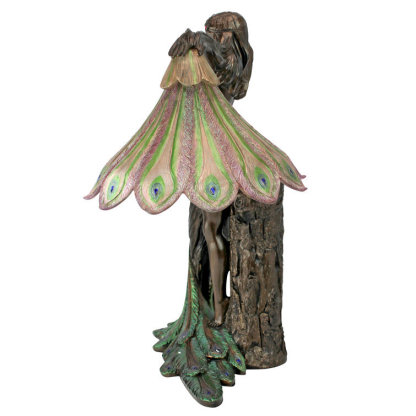 While there's an enchanting mythological thread of legend between the stately peacock and the fair goddess, this is the first time we've seen it rendered in sculptural form! The famous Peacock Goddess Lamp was a true sensation at the Salaon National dec Beaux-Arts exposition of 1901. It's a magnificent example of symbolism in Art Nouveau, this 15-inch dancing duo unfolds in a sparking, iridescent shimmer of tiny, faux jewels. Cast in quality designer resin and finished in faux French bronze, this exclusive accepts your single, 25-watt type "B" candelabra bulb.