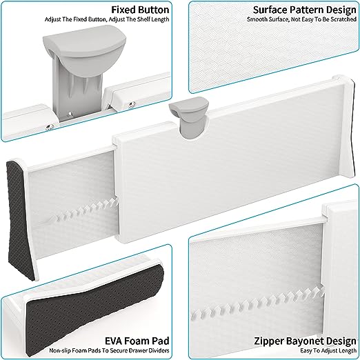 🧦【Expandable & Adjustable DesignEach of our drawer dividers and inserts has a retractable design, the expandable design fits most drawers and wardrobes, you can adjust it according to the size of the drawers in your home.