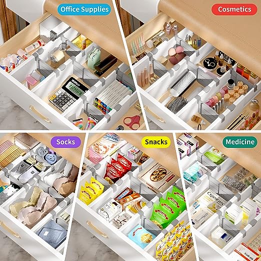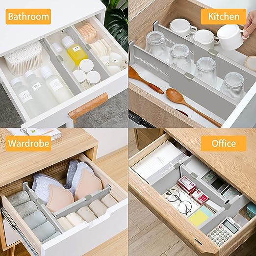 🧣【Multipurpose Drawer Dividers】These drawer organizers can be installed in any drawer in your home or office. For example, you can use them for kitchen silverware and cutlery drawer organizer, cosmetics drawer organizer, bathroom towel drawer organizer, drawer dividers for clothes such as socks, underwear, bras, ties. It can even be used as an office drawer organizer and toolbox organizer.