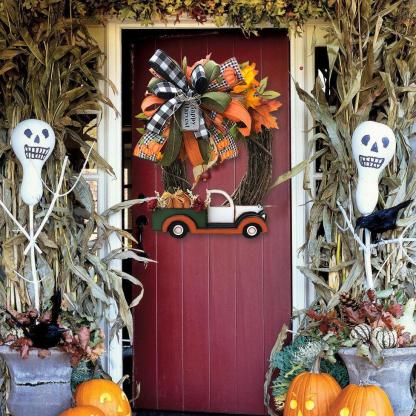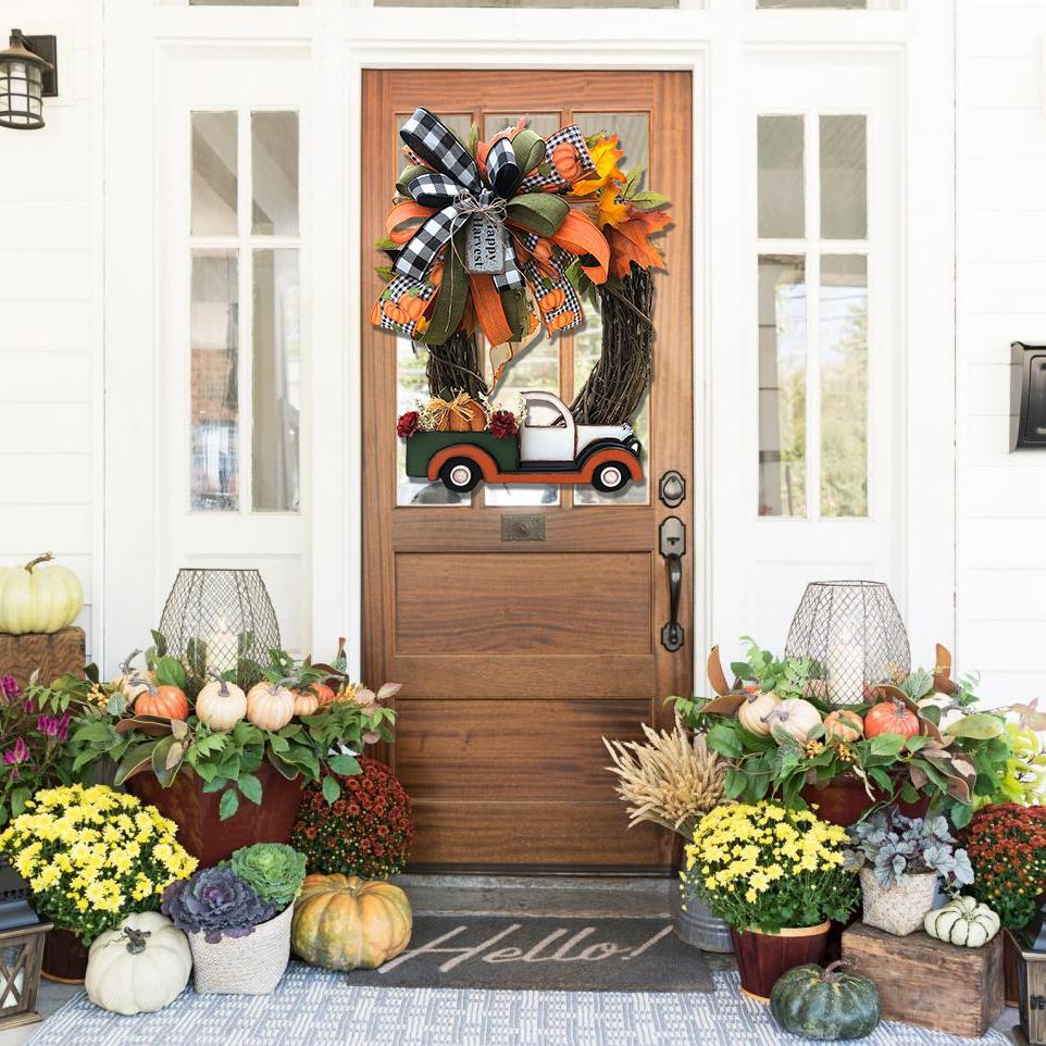 Material: outdoor realistic vines, weaving ribbon, Pumpkin decoration, Plaid Truck.