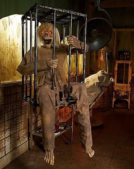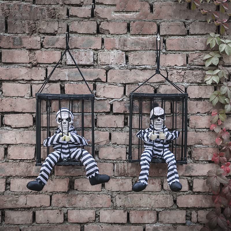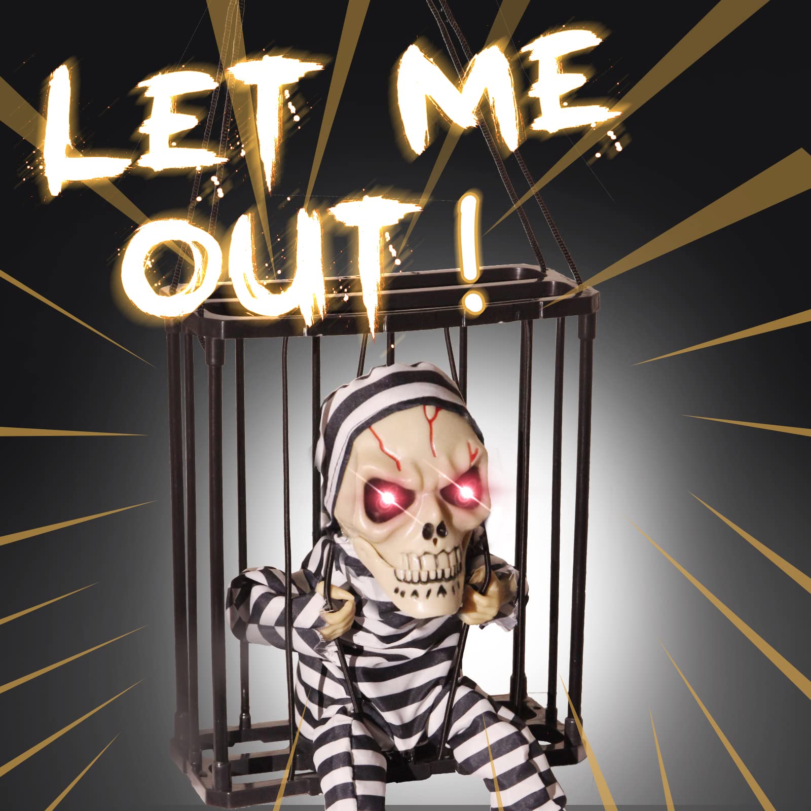 • 🎃 Scary Funny Skull Cage Prisoner: Scary skeleton ghost horror toy in a prison cage screamed ""Let me out!"". When trigger this animated halloween decor, the red eyes caged prisoner will reach his head out while screaming' let me out'. And it will definitely give a spook factor to your Halloween party decor.