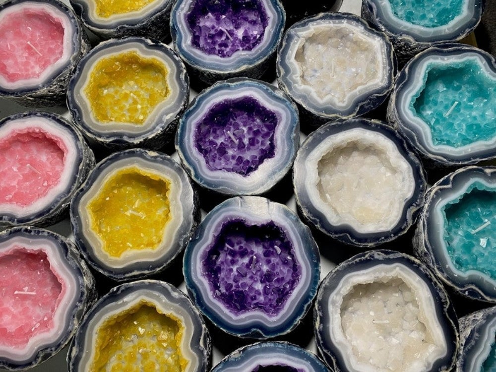 Inspired Design: Inspired by the wonder of opening geodes, our 100% wax candles feature a sparkling crystal bed and rings of natural agate.