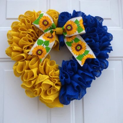 This beautiful heart shaped burlap wreath is handmade with yellow and blue burlap ribbons to represent Ukrainian flag, yellow stands for wheat fields and blue stands for the blue sky. This wreath is accented with a bow made out of the ribbon with sunflowers on it. Sunflower is a national flower of Ukraine.